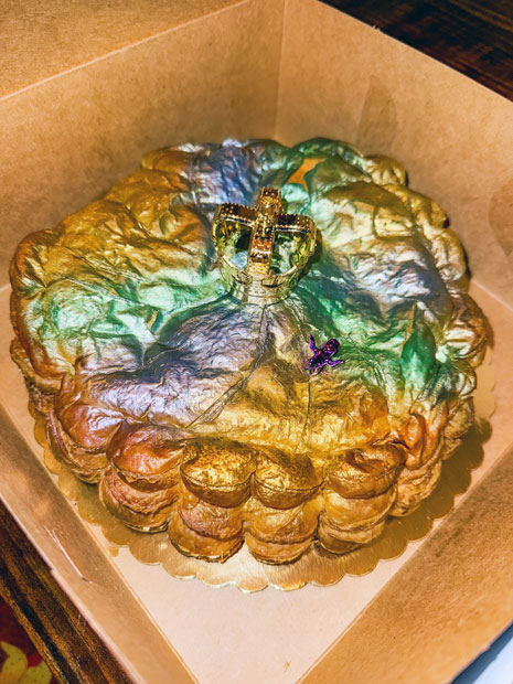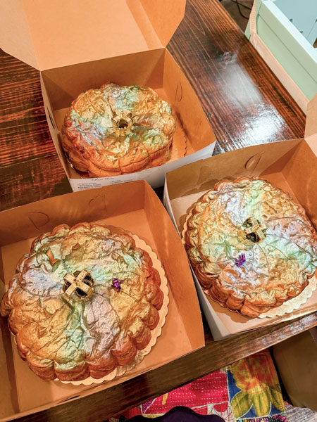 Where our local king cakes tend to be fluffy and yeasted, these are croissant-like, flaky and deeply buttery — something you can justify slicing into with a cup of coffee in the morning. Each one is finished with a tiny gold baby and crown and a dusting of purple, green and gold sparkle sugar that looks like edible Mardi Gras magic.