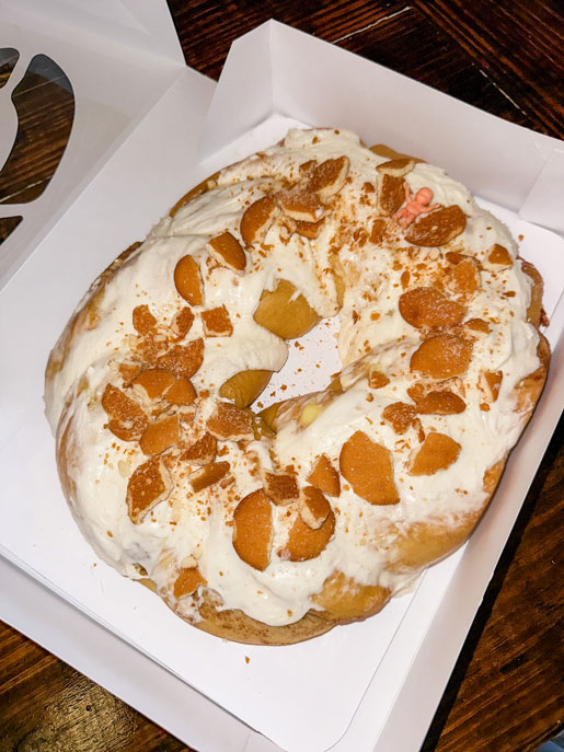 We tried their brand-new banana pudding king cake, and we were the first people to ever taste it — lucky us! It was spectacular: perfectly soft cake, generous banana cream filling and crisp Nilla wafers layered on top. It made so much sense that we immediately wondered why this flavor isn’t everywhere.