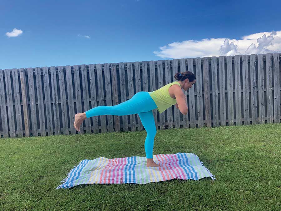 From the same lunge position, rotate your torso forward, lift your back leg off the ground, place your hands at your heart and hold. Then rotate the torso to the side, place both hands onto the ground and slowly lift your top arm toward the sky while keeping your back leg on the ground. Modify by keeping both hands on the ground.