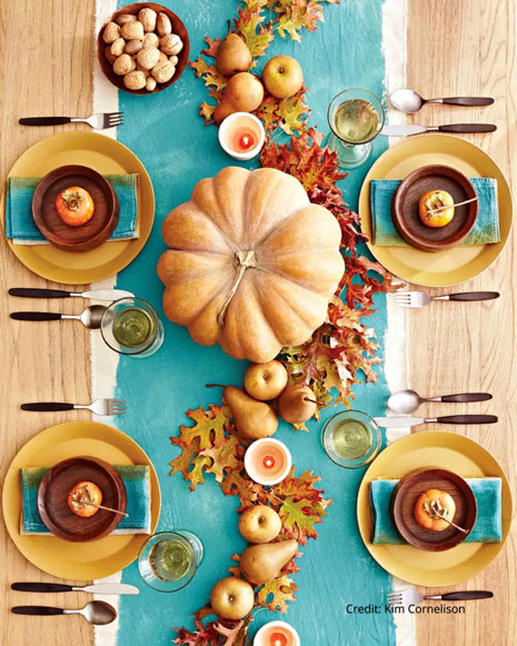 For décor, mix natural textures (wheat stalks, eucalyptus, wood chargers) with glam details (gold flatware, velvet pumpkins or metallic candle holders).