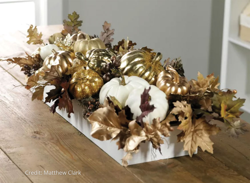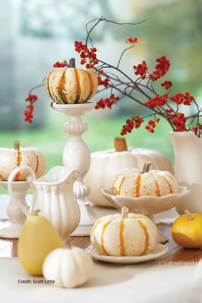 Let’s start with the star of the season: pumpkins. They’re no longer limited to bright orange and carved jack-o-lanterns. Faux pumpkins have truly gone wild!