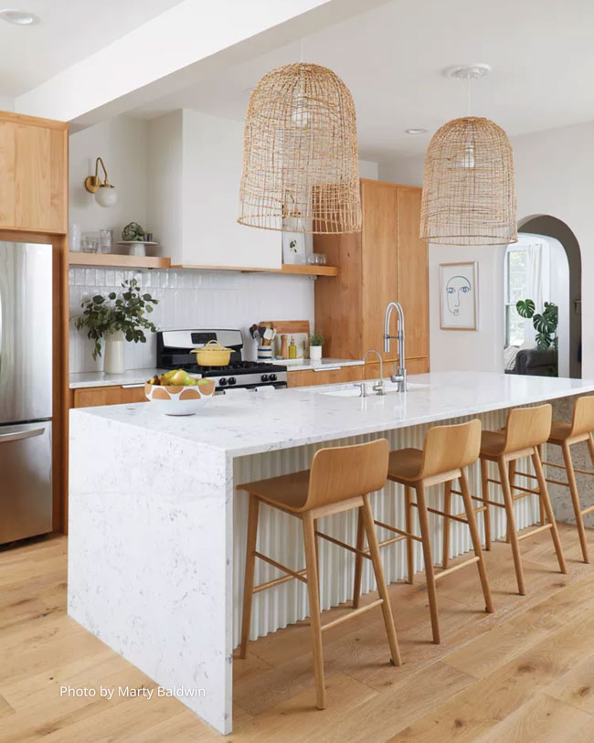 - Warm wood cabinetry mixed with light stone