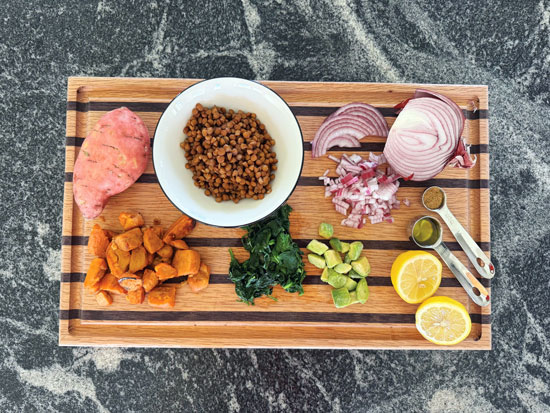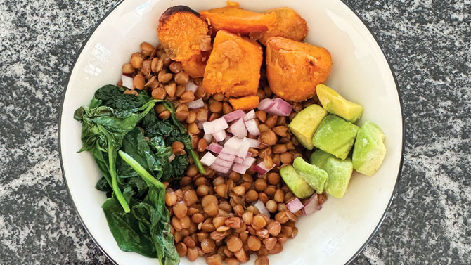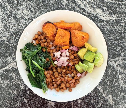 - Assemble your bowl by layering the lentils, roasted sweet potatoes, sauteed spinach and red onion. Top with avocado.